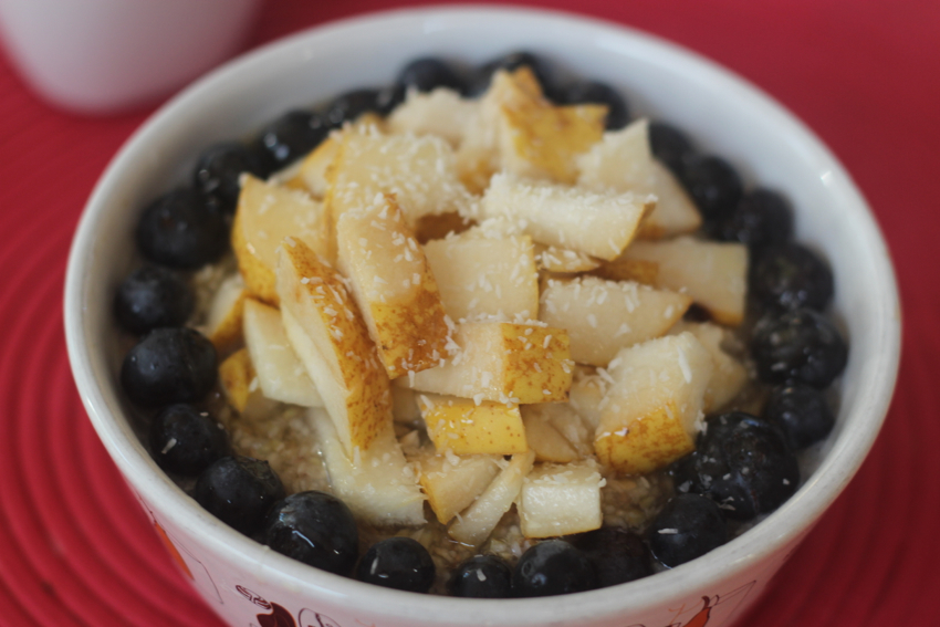 Takhle nějaké vypadají mé každodenní snídaně. Pohanková/ vločková kaše s hromadou ovoce. Samozrějmě nesmí chybět med a kokos.